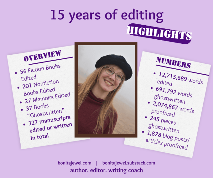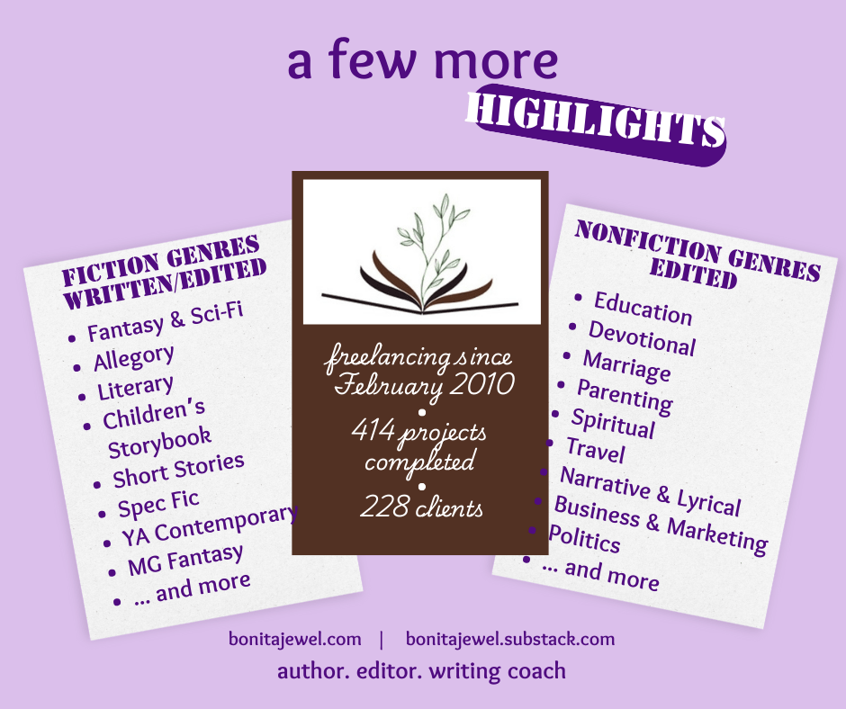 A top-rated freelancer, Bonita has successfully completed more than 300 writing and editing projects for clients. Learn more about how she can help you with your novel, blog, or memoir. She offers all levels of editing, from line to developmental editing to proofreading.