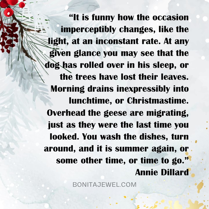 It is funny how the occasion imperceptibly changes, like the light, at an inconstant rate. At any given glance you may see that the dog has rolled over in his sleep, or the trees have lost their leaves. Morning drains inexpressibly into lunchtime, or Christmastime. Overhead the geese are migrating, just as they were the last time you looked. You wash the dishes, turn around, and it is summer again, or some other time, or time to go.